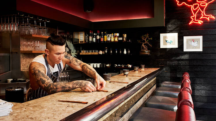 Daftar putar restoran, yang menampilkan lagu-lagu dari ABBA hingga Drake dan Madonna, menambah energi playful dan tidak sok. Sumpit diletakkan di atas cockerel keramik mini di antara hidangan, dan dapur terbuka memungkinkan tamu melihat fokus intens Sato saat bekerja di atas panggangan. Ruang yang baru direnovasi, dengan desain elegan dan pencahayaan lembut, meningkatkan suasana teatrikal namun nyaman, menjadikan setiap kunjungan terasa seperti acara spesial.