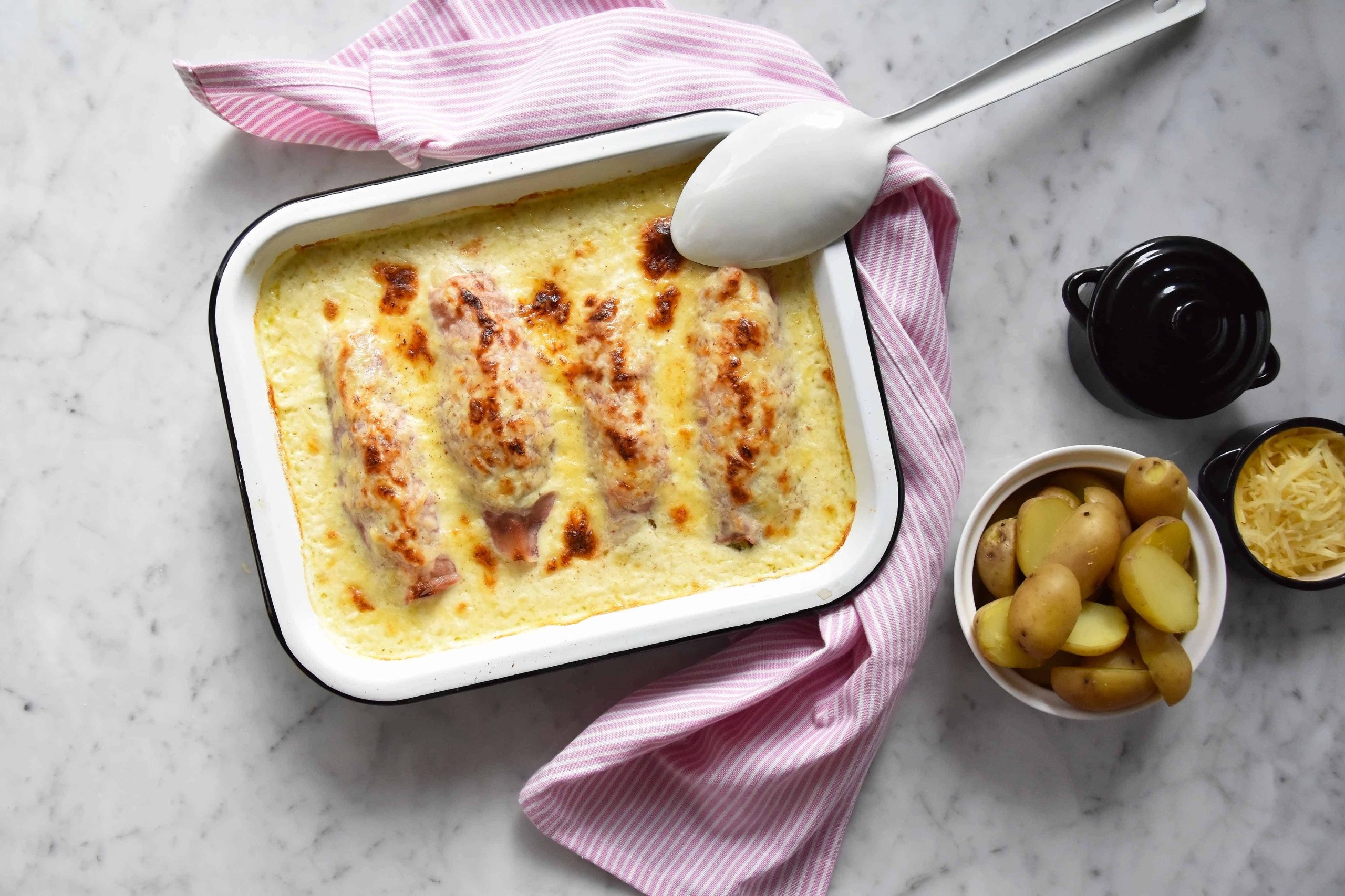 - Chicon au gratin au saumon → ganti ham dengan smoked salmon, tambah dill di saus